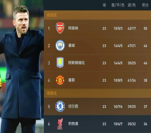 英超卫冕冠军赛季前23轮积分榜:利物浦36分列倒数第五