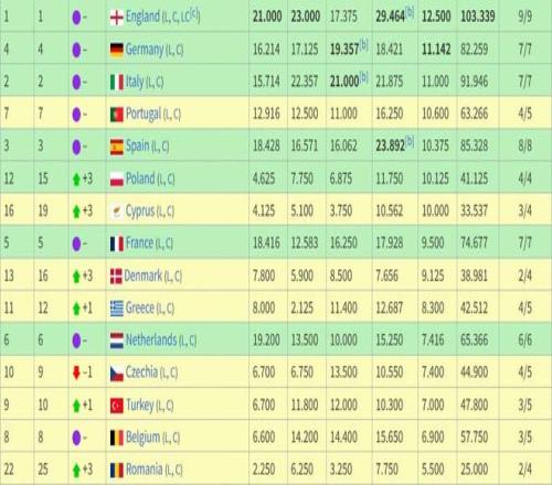 本赛季各国联赛欧战积分排名(前15):