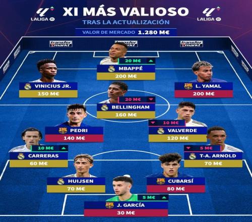 12月12日,德转更新了西甲球员的身价,并且列出最贵首发阵容。身价两亿欧的姆巴佩、亚马尔领衔,皇马和巴萨包揽11个位置,阵容总身价高达12.8亿欧。