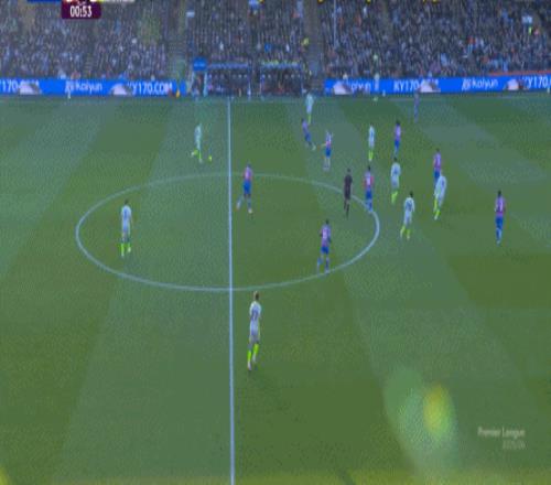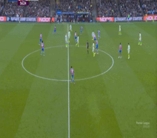 这使得水晶宫错过了他们的最好的战机窗口,因为体能问题即将找上门来,于是在此之后,水晶宫再无快速反击和进攻的机会,反倒是曼城,通过贝尔纳多-席尔瓦的牵制,暴露出了右侧禁区角的空间,找到了中场出身的努内斯,为后点的哈兰德送上了传中: