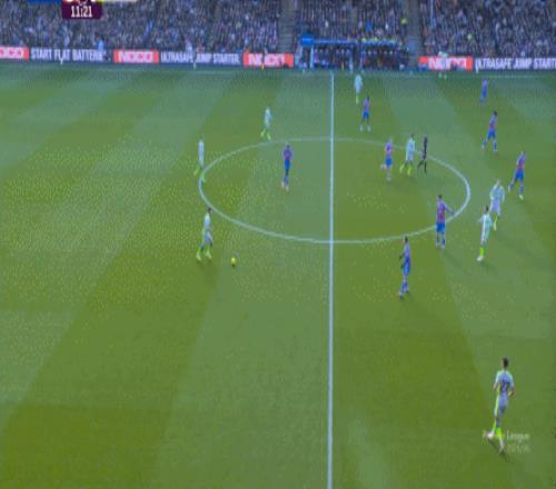 边后卫奥赖利拉到了边路,福登则出现在左肋的位置,所以当福登回撤接球,从而吸引出水晶宫的右中卫理查兹的时候,身后便出现了空当,这就是赖因德斯通过插上形成的机会: