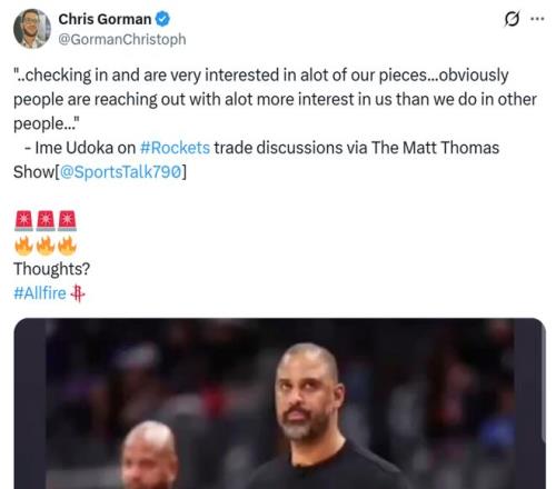 乌度卡表示内部正在讨论这一话题,电话的确一直响个不停,相比火箭主动联系其他球队,近期联系火箭询问潜在交易的其他球队明显更多。