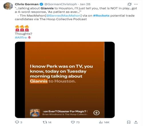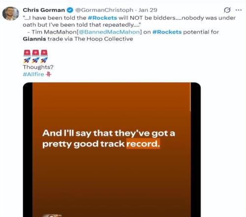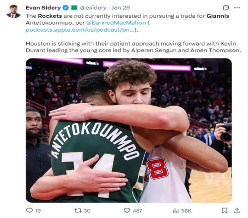 早在1月28日,ESPN记者布兰德-麦克马洪的播客节目中,他就说过:我只想告诉你们,扬尼斯交易火箭一事根本不可能,火箭对现有阵容一如既往的耐心。